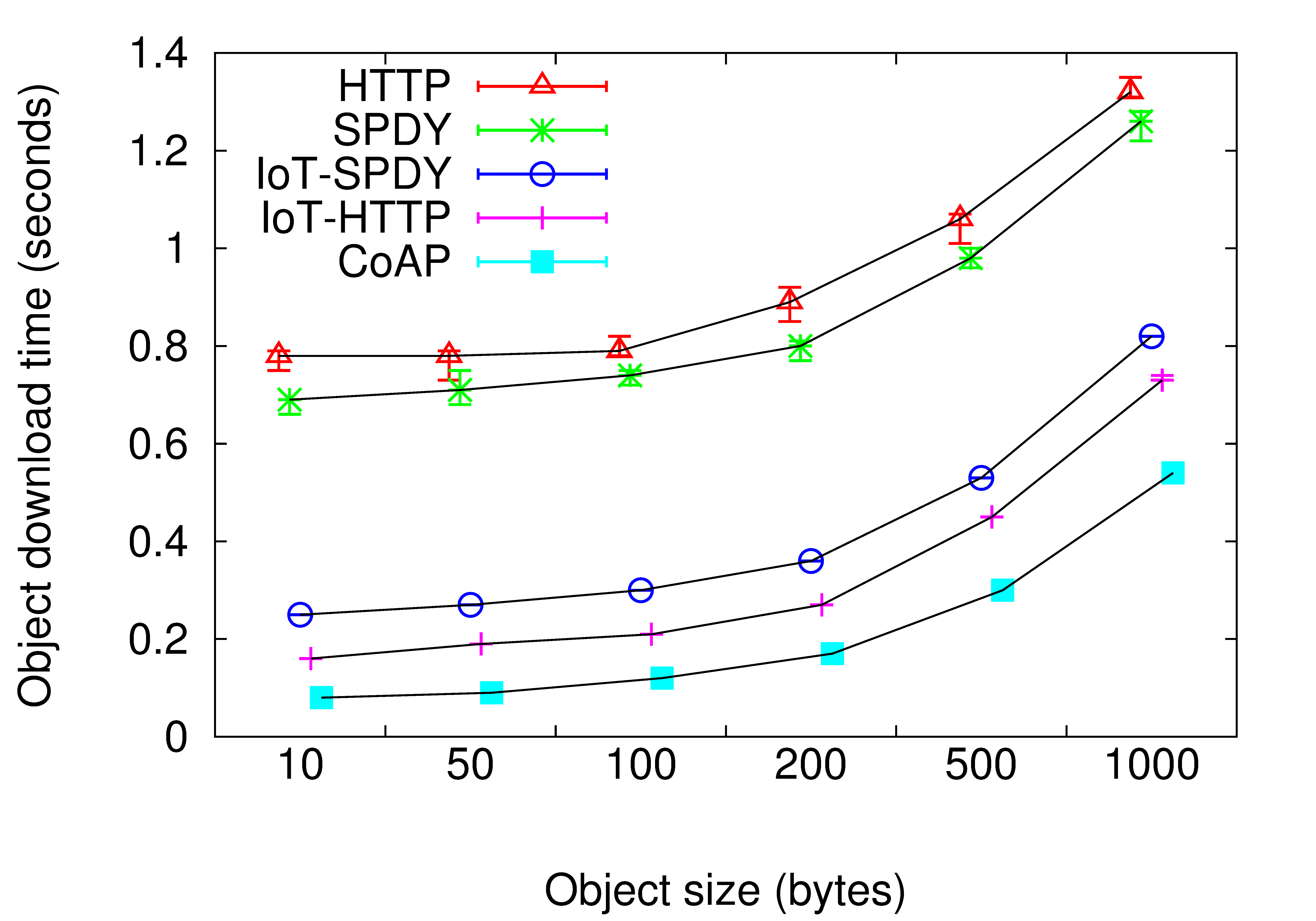 Fig 4 shows the object download times for different object sizes from server to the client when using the different transport services CoAP, HTTP, SPDY, IoT-HTTP and IoT-SPDY. The object download time is the duration between the time the client initiates the request for the object to the time the last byte of the object arrives at the client. We observe that the object download times increase with the size of the object requested in all the five cases. CoAP has the lowest object download times as the protocol overhead for CoAP is quite small. It can be clearly seen that TFO decreases the object download times for IoT-HTTP and IoT-SPDY. The object download time is decreased also due to the minimized headers for IoT-HTTP and IoT- SPDY. There is at least 50 % reduction in object download time for IoT-HTTP and IoT-SPDY compared to HTTP and SPDY.